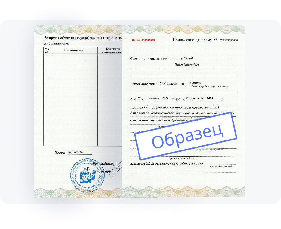 По окончании программы слушатели получают диплом о профессиональной переподготовке, который выдается на основании успешного прохождения аттестации. Этот документ подтверждает получение нового профобразования и квалификации, что открывает доступ к руководящим должностям в технических и производственных организациях.