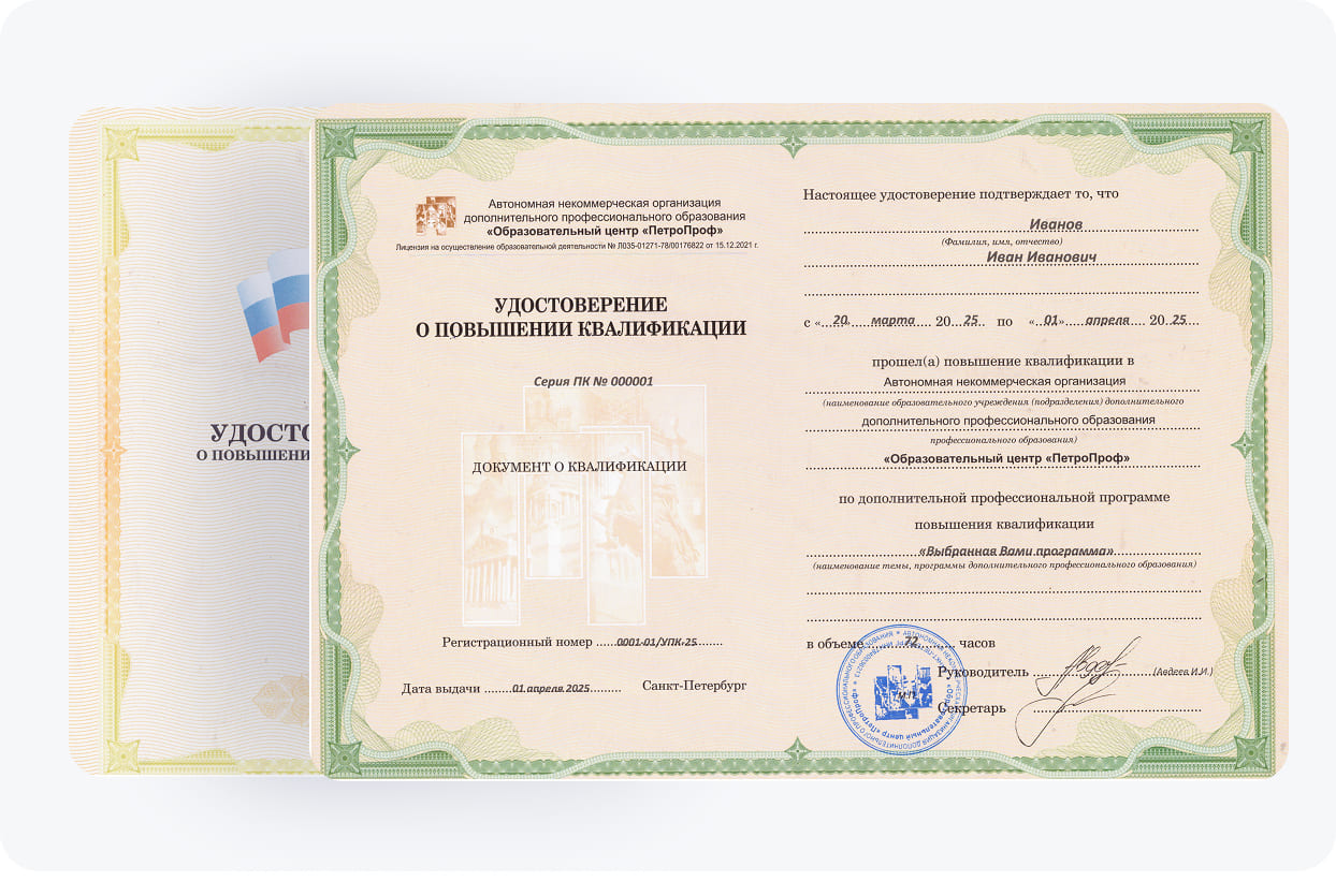 Наши программы повышения квалификации разработаны с учетом государственных требований и стандартов.Они характеризуются структурированным материалом и большим перечнем тем, актуальных при дальнейшем ведении деятельности. После окончания курса выпускники центра "ПетроПроф" получают все необходимые для трудоустройства документы. В этот комплект входит и удостоверение о повышении квалификации, подтверждающее приобретенные компетенции, навыки и знания.